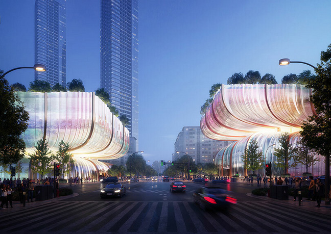اين طرح شامل دو ساختمان کريستالي متقارن با نماهاي شيشهاي موجدار و بامهاي پوشيده از گياه است که ارتباط جديدي بين مرکز خريد و فضاي شهري اطراف ايجاد ميکند.