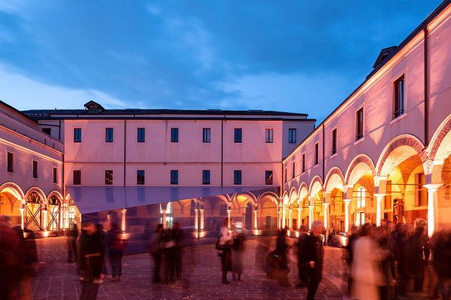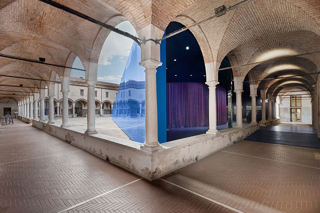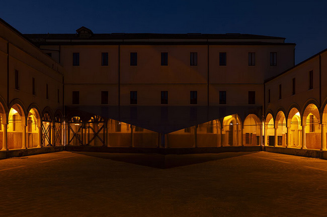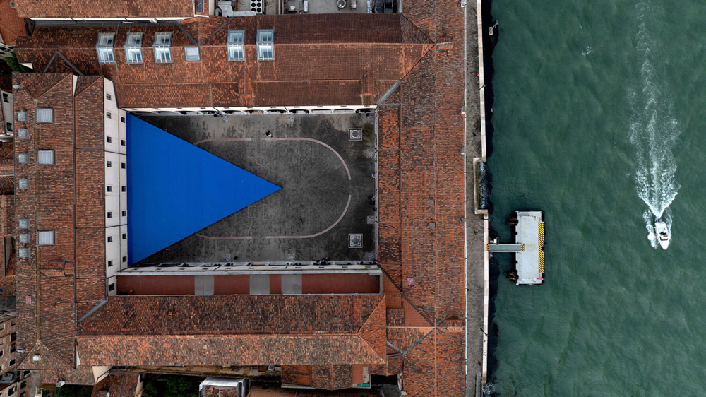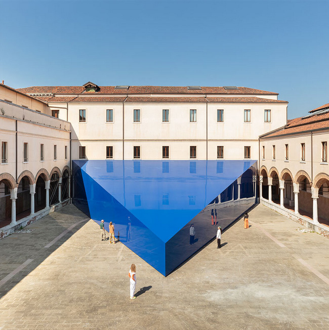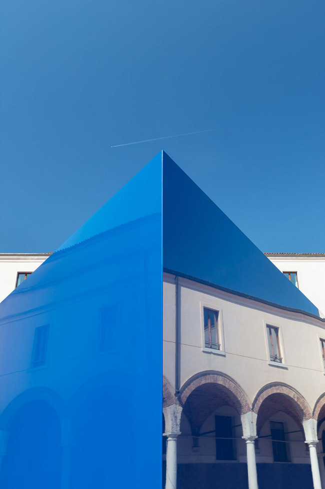به گزارش گالري آنلاين، اين هرم آبي مثلثي به نظر ميرسد که از فضا به حياط رنسانس «آکادمي زيباييهاي هنر ونيز» افتاده است.