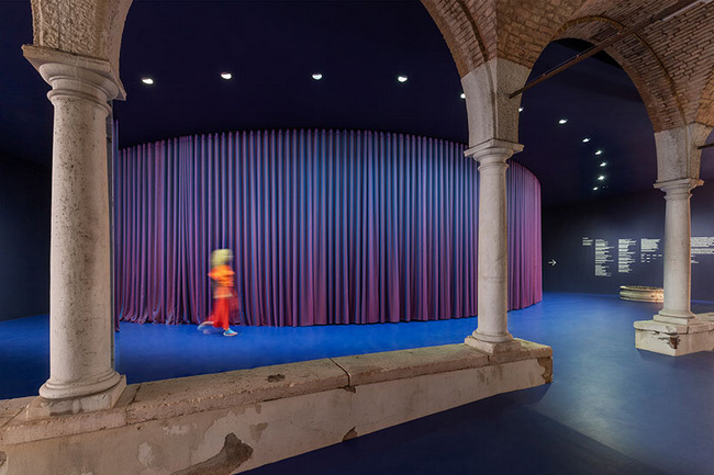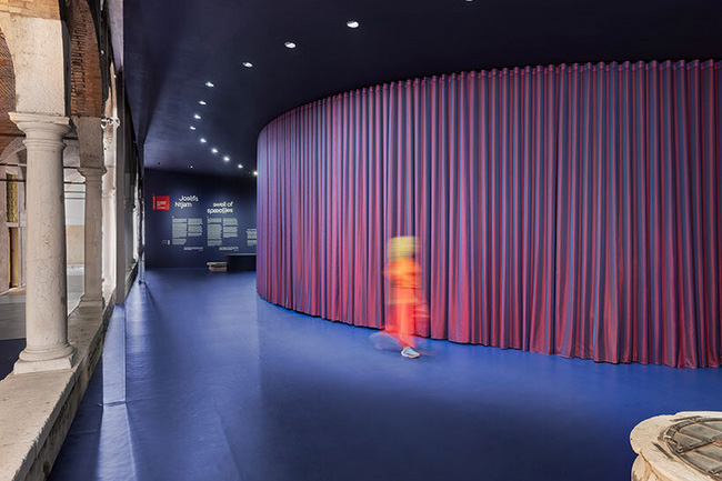 درون اين پويش از UNA/UNLESS، پرده نرم و محدب ردپاي يک کليساي سنگي را به ياد ميآورد که به طور اوليه توسط «جاکوپو سانسويينو» طراحي شده بود و از ۱۵۶۵ تا ۱۸۳۱ در اين مکان قرار داشت. اين منطقه که قبلاً محراب بود، اکنون ديواري خميده با LED را نمايش ميدهد که انيميشنهاي توليد شده توسط هوش مصنوعي جوزفا نجام را به نمايش ميگذارد و به چالشهاي تاريخي برقراري و دياسپوراي آفريقايي ميپردازد.