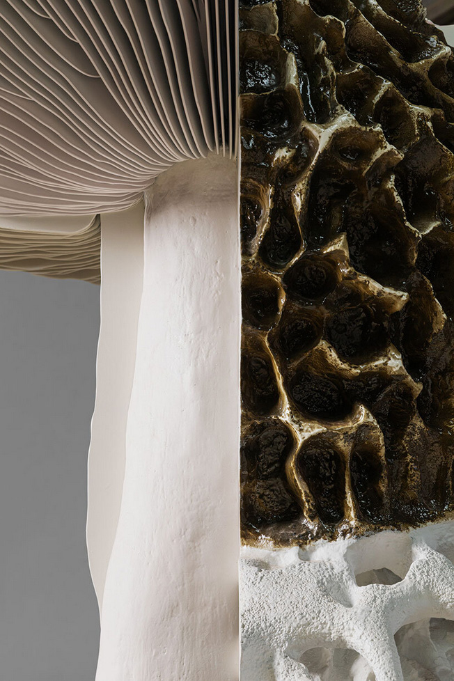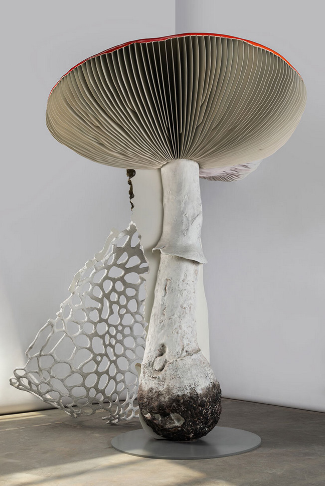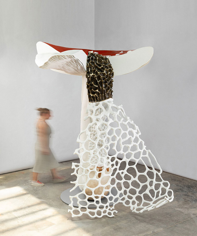 اين اثر هنري که حدود سه متر ارتفاع دارد، سه گونه قارچ مختلف را در قالب يک فرم ترکيبي و هيبريدي به تصوير ميکشد.