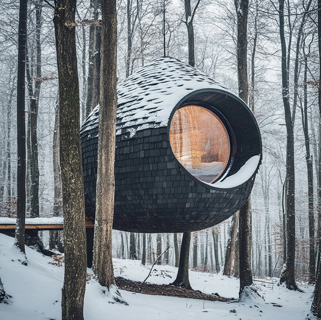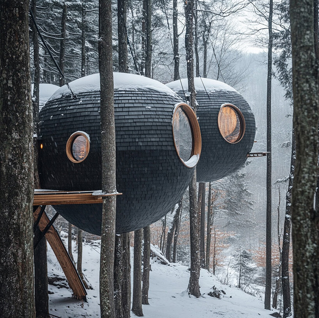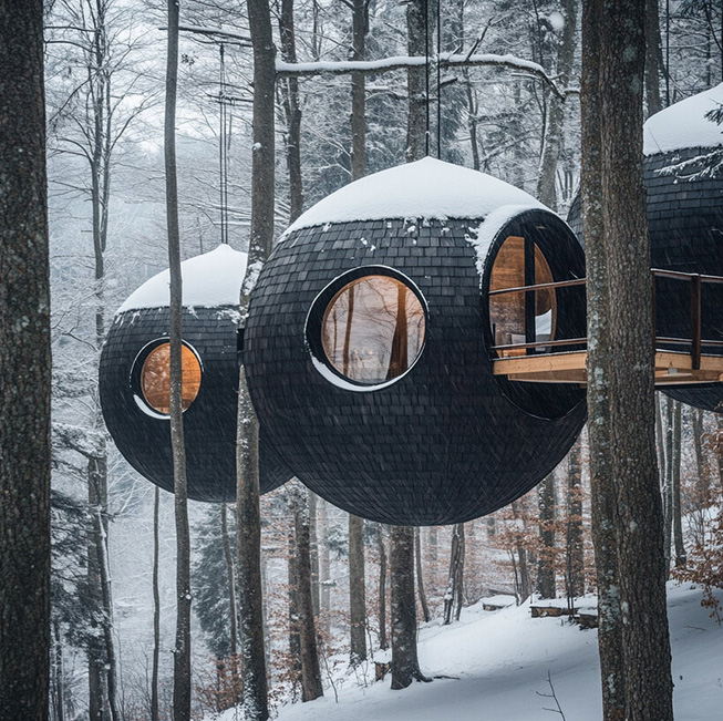 اين طرح شامل مجموعهاي از خانههاي درختي کرويشکل و معلق است که در ميان درختان جنگل قرار دارند.