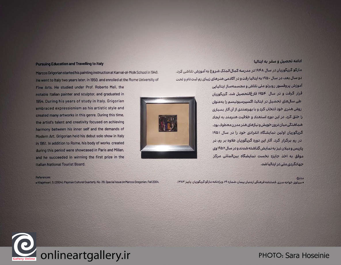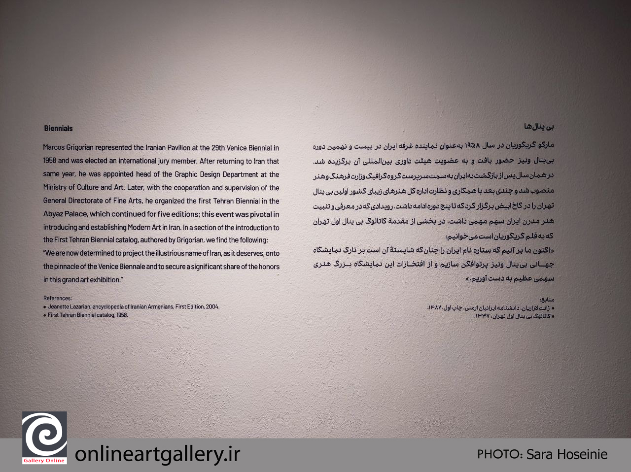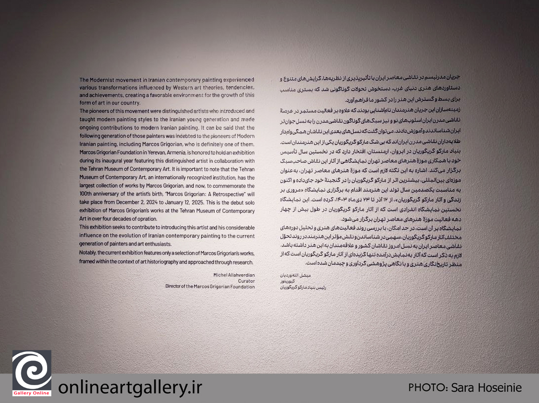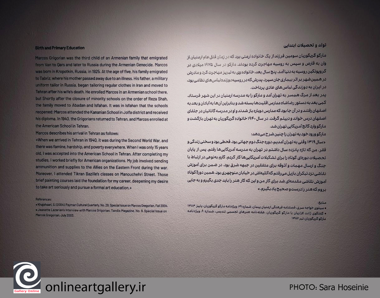 بنياد مارکو گريگوريان با همکاري موزه هنرهاي معاصر تهران به مناسبت يکصدمين سال تولد نمايشگاهي تحت عنوان «مروري بر زندگي و آثار مارکو گريگوريان» را در موزه هنرهاي معاصر تهران برگزار نموده.