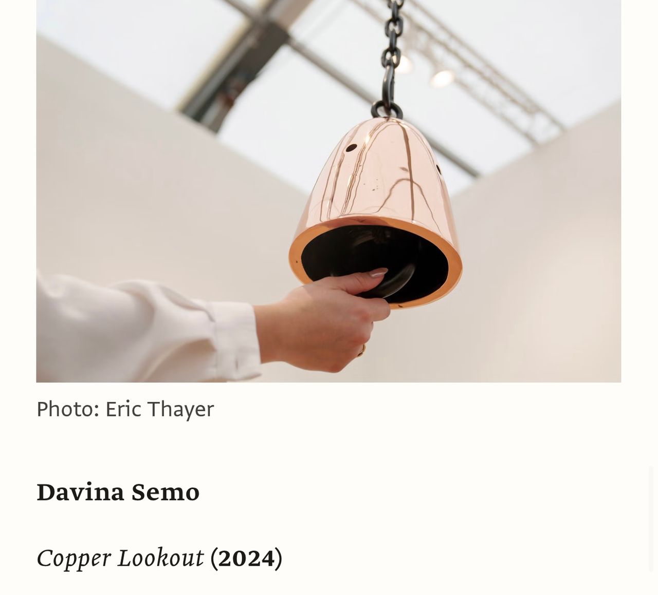 اين زنگ يکي از بيش از ۲۰ زنگي است که داوينا سمو، هنرمند ساکن لسآنجلس، ساخته است. تمامي اين زنگها از جنس برنز و در اندازهها و بافتهاي مختلف طراحي شدهاند، بهگونهاي که هنگام نواخته شدن، هارمونيهاي منحصربهفردي ايجاد ميکنند. هاکي سرهات کاچکلي، مدير فروش گالري، تأکيد ميکند که اين اثر همچنان براي خريد موجود است و قيمت آن ۱۸,۰۰۰ دلار است.