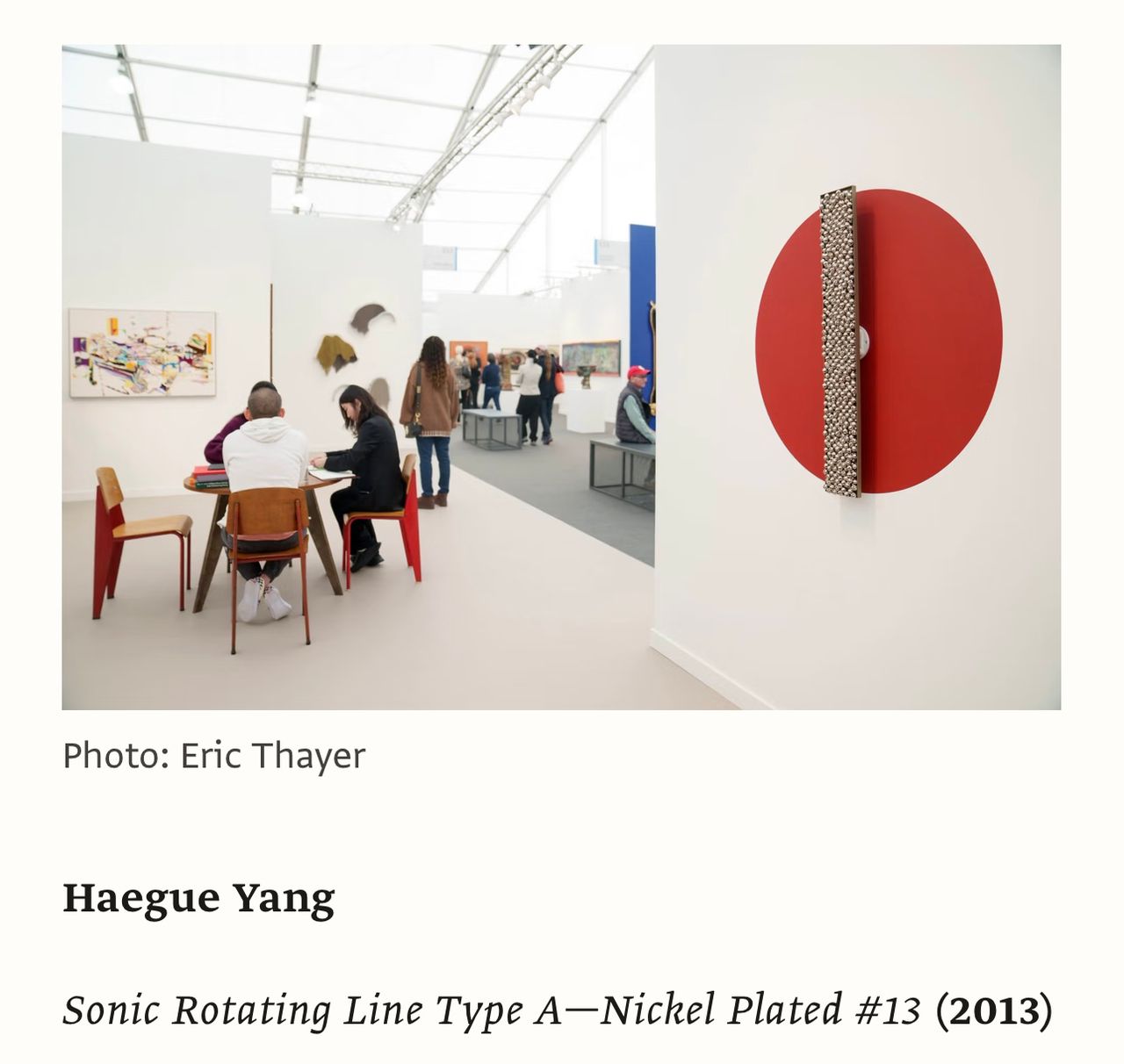 اين مجسمه چرخان لذتبخش، ساخته هگ يانگ، شامل صدها زنگوله کوچک با روکش نيکل است که هنگام چرخش، صداي ظريف و موزوني توليد ميکنند. يکي از کارکنان گالري Kukje ميگويد: «اين يکي از اولين آثار اين مجموعه است.» يانگ اين مجموعه را در نسخههاي مختلف با زنگولههاي متنوع ادامه داده است. اين نسخه، که در سال ۲۰۱۳ خلق شده، با قيمت *۴۰,۰۰۰ يورو* به فروش ميرسد. خريداران ميتوانند رنگهاي ديگري را نيز انتخاب کنند که همگي بهصورت سفارشي و با طراحي خود هنرمند ارائه ميشوند.