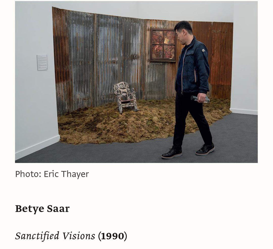 اين چيدمان شامل دو اثر از بتيه سار، هنرمند سرشناس لسآنجلسي است که سال آينده تولد ۱۰۰ سالگي خود را جشن خواهد گرفت. جولي رابرتز، مدير گالري، ميگويد: «پنج سال پيش شروع به ديجيتالي کردن آرشيو بتيه کرديم. در اين فرايند، صندلي Critter و عکسهاي چشماندازهاي مقدس را پيدا کرديم.» در اين اثر، صندلي به جلو و عقب تکان ميخورد و چمن تا گوشه غرفه گالري امتداد مييابد. اين چيدمان به نويسنده زورا نيل هرستون اداي احترام ميکند. صندلي و پنجره بهصورت جداگانه براي فروش عرضه شدهاند— صندلي ۲۰۰,۰۰۰ دلار و پنجره ۳۰۰,۰۰۰ دلار. رابرتز ميگويد که برخي از موسسات فرهنگي به خريد اين آثار ابراز علاقه کردهاند.