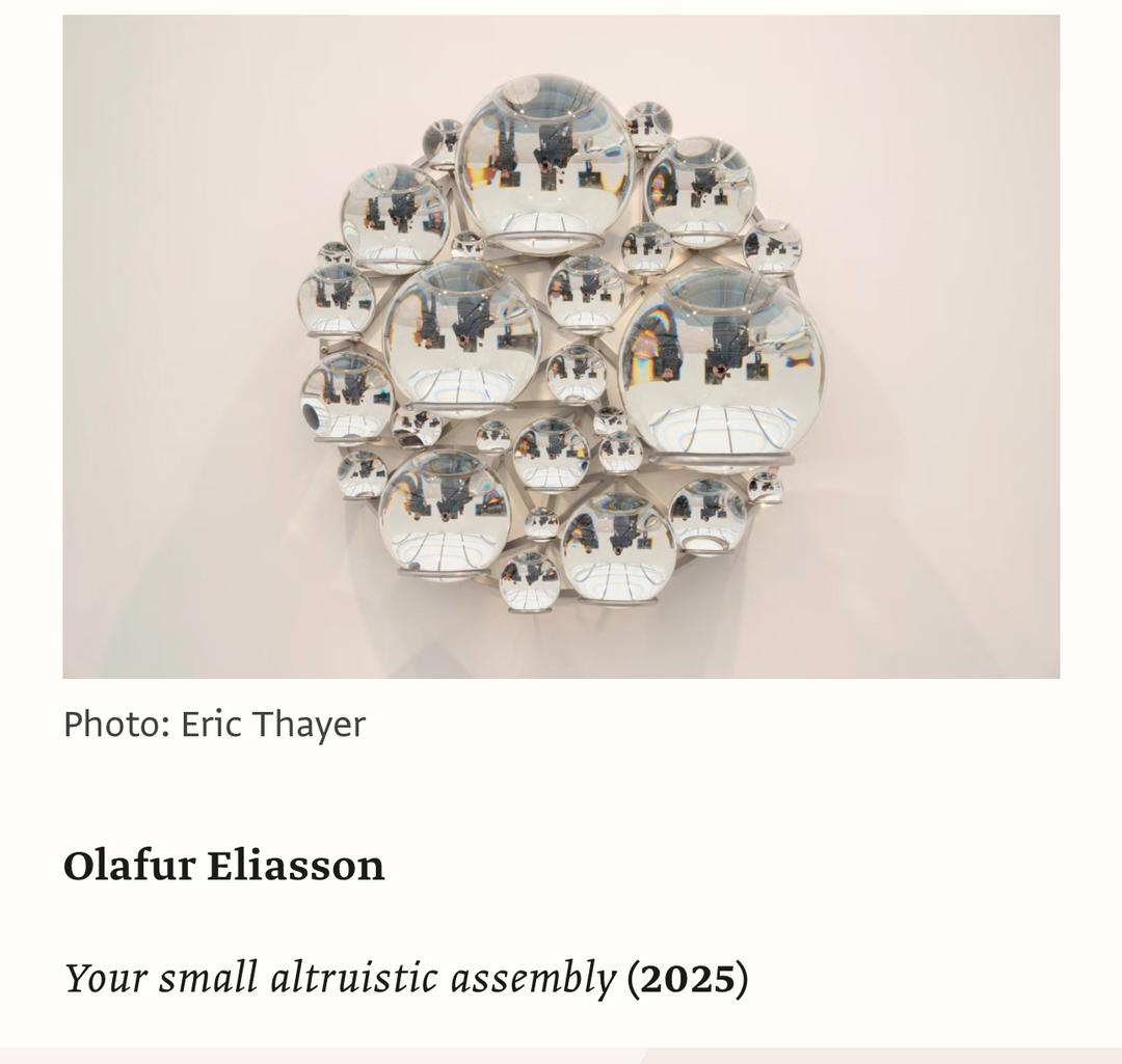 الياسون، هنرمند دانمارکي-ايسلندي، بخش زيادي از فعاليت خود را به بازآفريني پديدههاي حسي و بصري اختصاص داده است—نمونهاي از آن را ميتوان در نمايشگاه انفرادي او در موزه هنر معاصر لسآنجلس (تا ۶ جولاي) مشاهده کرد. تازهترين اثر او در مجموعه گويهاي شيشهاياش، فرصتي اغواکننده براي ديدن بازتابي کوچک و وارونه از خود را فراهم ميکند. اين اثر از شبنم، گل آفتابگردان و جلبک الهام گرفته شده است. يکي از کارکنان گالري تأييد کرده که اين اثر در صبح روز دوم نمايشگاه فروخته شده، اما قيمت آن فاش نشده است.