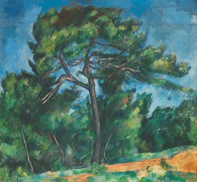 در اين نقاشي يک درخت بلند و باشکوه بر ترکيببندي غلبه دارد، اما به نظر ميرسد که تحت فشار چيزي در حال تقلاست. با اين حال، سزان هيچ نشاني از باد يا نيروي خارجي بر درخت نشان نميدهد. درخت بهتنهايي ايستاده است، خميده و ناهموار، در حالي که پويايي و عظمت آن، درختان کوچکتر را تحتالشعاع قرار داده و حتي باعث شده آنها نيز از آن فاصله بگيرند. اين اثري خارقالعاده است.