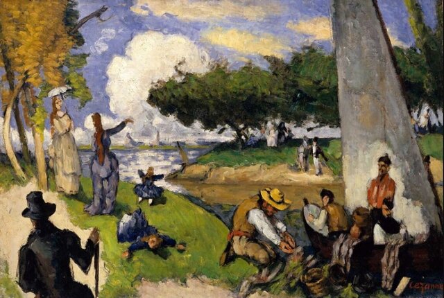 اين اثر از سزان در سومين نمايشگاه امپرسيونيستها در سال ۱۸۷۷ ميلادي در پاريس به نمايش درآمد. مردي به رنگ سياه از کنار گروهي از ماهيگيران و زنان خوشلباس که از روزي رنگارنگ و آفتابي در کنار ساحل لذت ميبرند، عبور ميکند. اين يک صحنه گرم و دلنشين است. اين نقاشي يک نمونه اوليه از تغيير پالت رنگي سزان از رنگهاي تاريک دهه گذشته به رنگهاي روشنتر است که او در سالنهاي امپرسيونيستها در دهه ۱۸۷۰ به نمايش گذاشت. اين اثر تحت تأثير نقاشيهاي فضاي باز کلود مونه و ادوارد مانه قرار گرفته است. او همچنين از نقاشان رنسانس، مانند تيتان و رافائل، الهام گرفت.