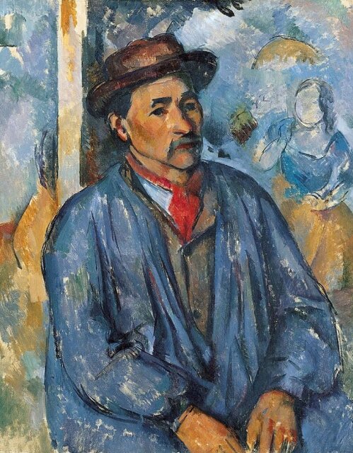 مردي که در اين پرتره به تصوير کشيده شده، همچنين در نقاشيهاي ورقبازان «سزان» در حوالي ۱۸۹۰ نيز به تصوير کشيده شده است. مانند بسياري از آثار متأخر سزان، اين قطعه نمايشي چشمگير از چگالي و تجربهگرايي است. در سمت راست مرد، يک نقاشي از زني با يک چتر ديده ميشود. در واقع، اين تصوير بخشي از يک پاراوان تاشو بوده که سزان اولين اثر هنري خود را روي آن نقاشي کرده است. تضاد بين اين پسزمينه و کارگر روستايي با کت آبي ممکن است نماد دوگانگي ميان مردان و زنان، تفاوت طبقاتي يا حتي آگاهي بازيگوشانه سزان از تکامل خود به عنوان يک هنرمند باشد.