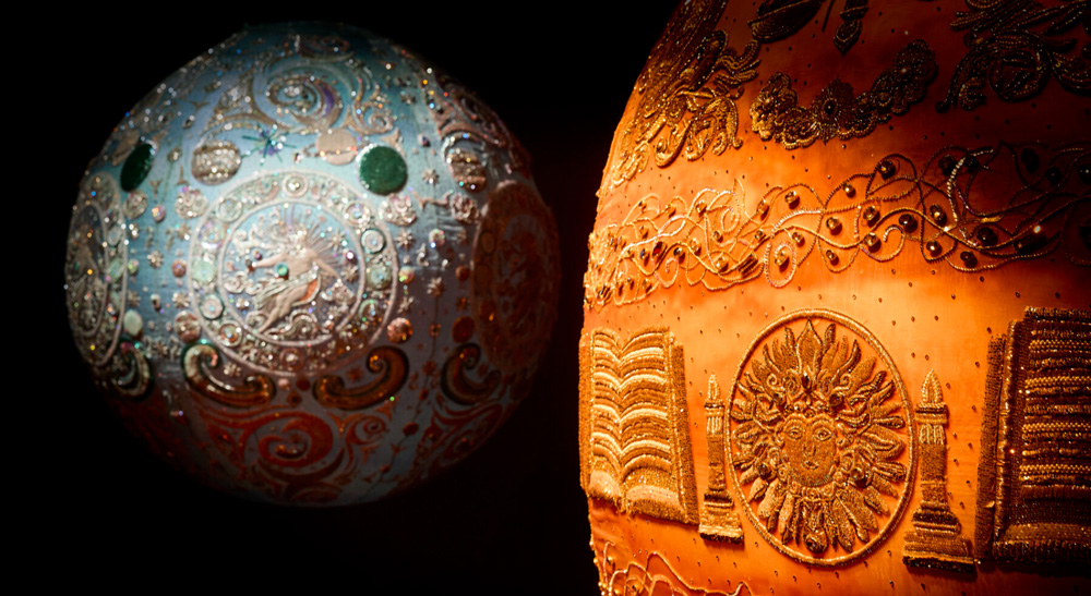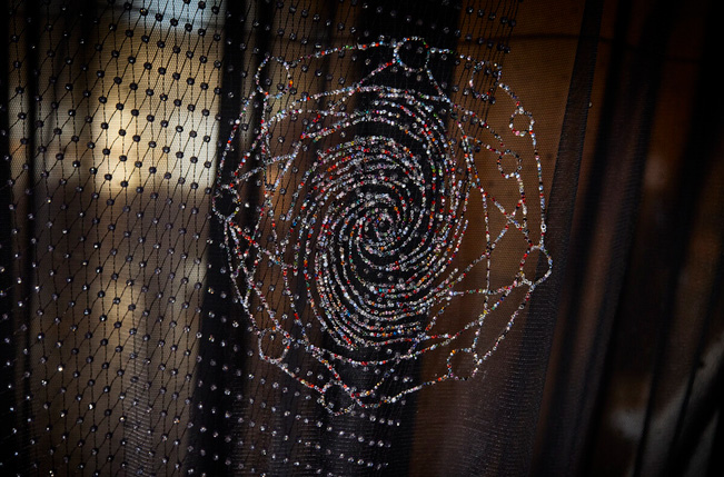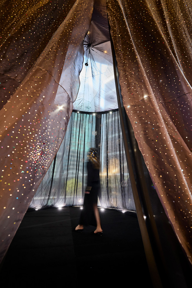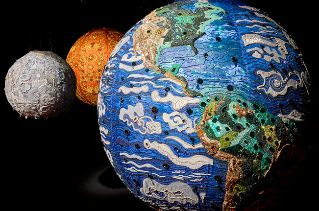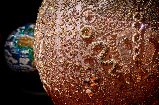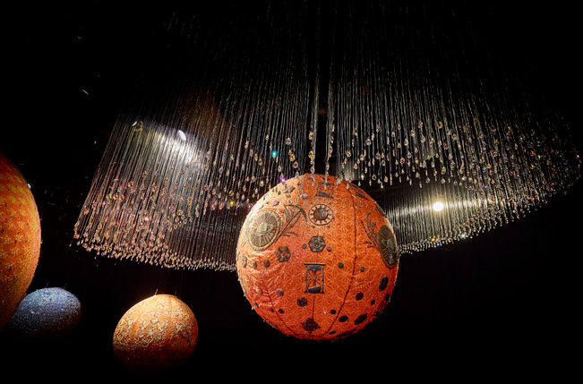 در مرکز اين گفتوگو، اثر «نظام جواهر» از سارا شکيل قرار دارد که منظومه شمسي را بهصورت يک نقشهي درخشان و فراگير بازآفريني ميکند. شکلهاي بزرگ سيارهاي که بهدست صنعتگران و با استفاده از بيش از ۳.۹ ميليون کريستال شيشهاي قديمي سوزندوزي شدهاند، بازتابي از شيفتگي شکيل به روايتهاي کيهاني است؛ علاقهاي که در ابتدا از طريق کلاژهاي ديجيتالي آغاز شد. در کنار اين اثر، «آفرينش در جواهرات» نيز لحظهي آغازين انفجار بزرگ (بيگ بنگ) را از طريق لايههايي از پارچههاي سوزندوزيشده و کريستالهاي معلق در دل توري سياهِ فراگير، به يک تابلوي آسماني بدل ميسازد.