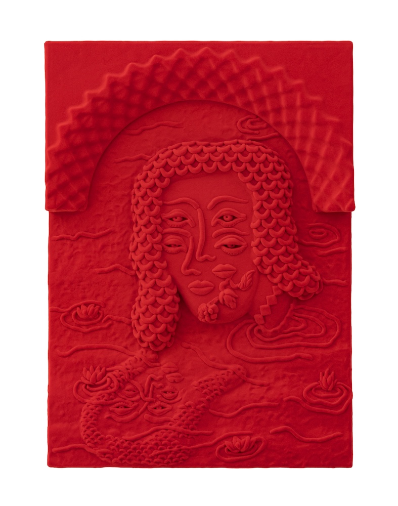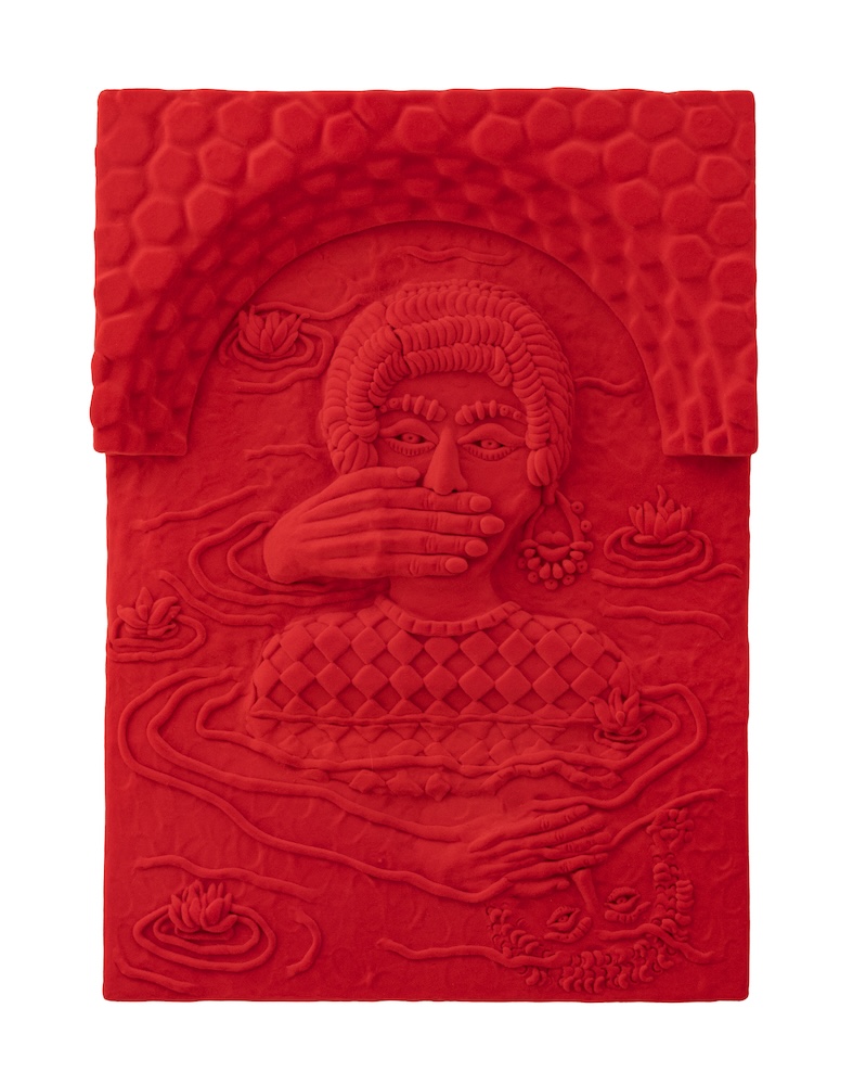 Mamali Shafahi, “Echoes of Euphoria V,” 2025, Flocked epoxy clay, 70 x 50 x 7 cm, courtesy of Dastan.