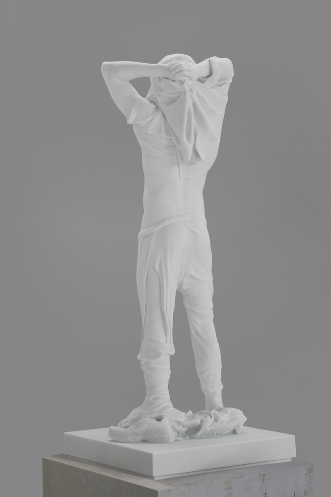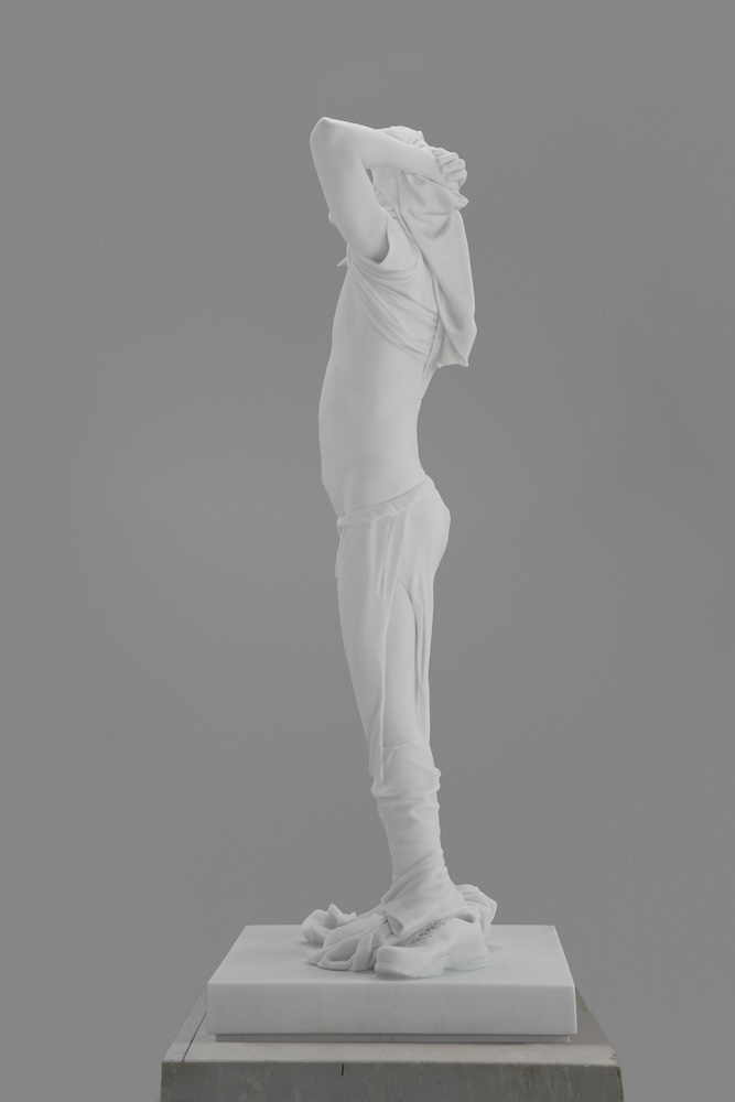 Reza Aramesh, “Action 246: At 1:00 pm, Thursday 08 December 2022,” 2025, hand carved and polished Bianco Michelangelo marble, Approximately: 106.5 x 39.5 x 44 cm, courtesy of Dastan.