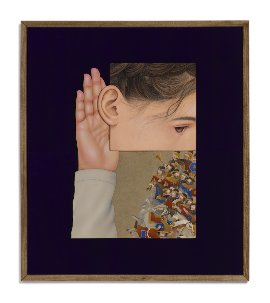 Arghavan Khosravi, “Listen,” 2021, acrylic on cotton canvas over wood panel and acrylic on wood cutout, 81.3 x 71.1 x 3.8 cm, courtesy of Dastan.