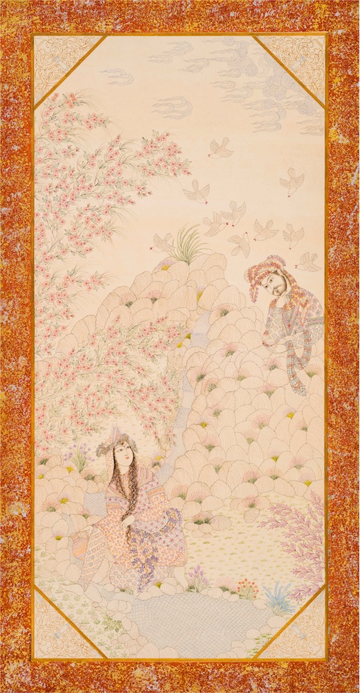 ![]() Farah Ossouli, “Cheshmeh,” 2025, gouache on paper, 70 x 30 cm, courtesy of Dastan. | ![]() Farah Ossouli, “Naz va Niaz,” 2025, Gouache on paper, 76 x 41 cm, courtesy of Dastan. |